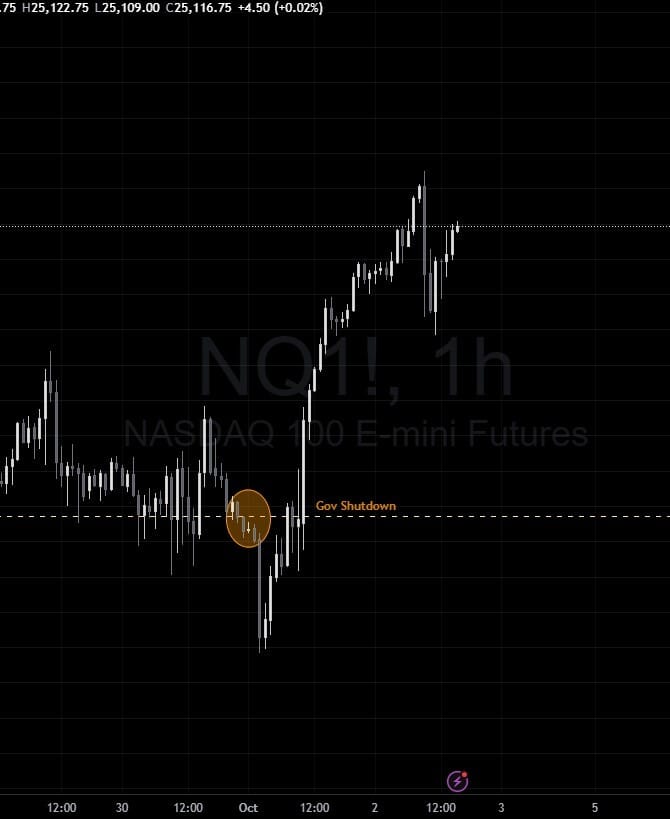 Markets are their own machine. A shutdown doesn’t shut down price action. News shocks spark blimps of volatility - but the real trend is always revealed once NY volume takes over.