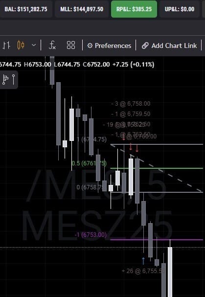 In today’s session I took a short on ES (S&P 500) instead of Nasdaq. Volatility expansion was much clearer on ES, setting up a clean “sell the rip” scenario. Executed down to a new low, and locked in my usual 1:1 risk-to-reward.